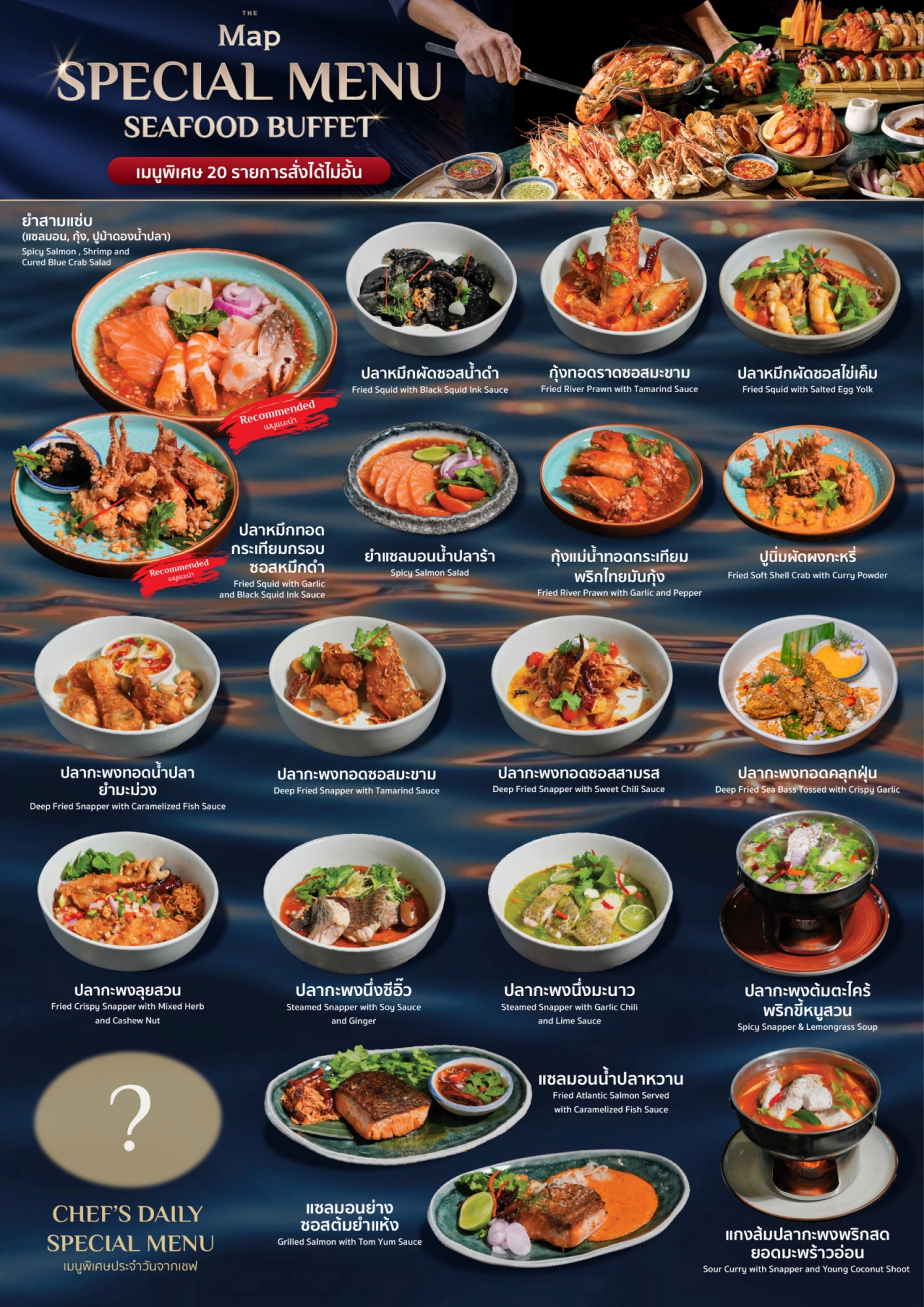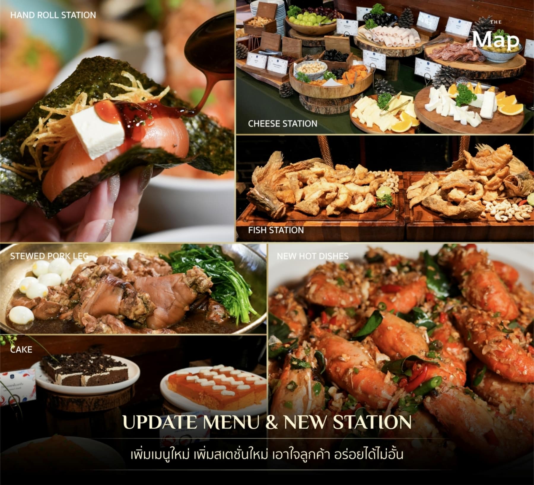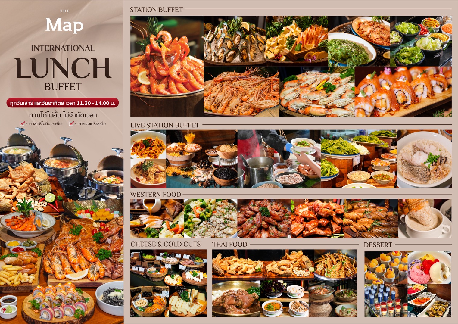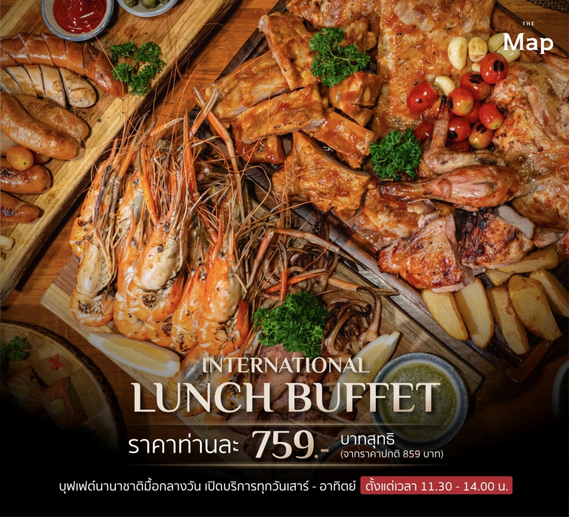 บุฟเฟ่ต์อาหารนานาชาติ มื้อกลางวัน พบกับสเตชั่นอาหารไทยและยุโรป อาทิเช่น สเตชั่นพาสต้า, ซูชิ, สลัดบาร์, สเตชั่นข้าวต่างๆ อาทิเช่น ข้าวผัด, สเตชั่นก๋วยเตี๋ยวต้มยำไข่ออนเซ็น, สเตชั่นของหวาน ไอศครีม, และผลไม้ตามฤดูกาล ในราคาเพียง 759 บาทสุทธิ/ท่าน (จากราคาปกติ 859 บาท) *เมื่อจองผ่านทางออนไลน์เท่านั้น แล้วพบกันทุกวันเสาร์และวันอาทิตย์ เวลา 11.30 – 14.00 น. ไม่จำกัดเวลาทาน…จนกว่าคุณจะอิ่ม ที่ห้องอาหาร THE Map