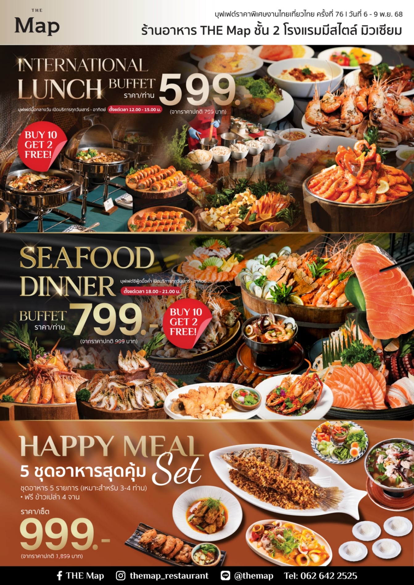บุฟเฟ่ต์อาหารนานาชาติ มื้อกลางวัน พบกับสเตชั่นอาหารไทยและยุโรป อาทิเช่น สเตชั่นพาสต้า, ซูชิ, สลัดบาร์, สเตชั่นข้าวต่างๆ อาทิเช่น ข้าวผัด, สเตชั่นก๋วยเตี๋ยวต้มยำไข่ออนเซ็น, สเตชั่นของหวาน ไอศครีม, และผลไม้ตามฤดูกาล ในราคาเพียง 699 บาทสุทธิ/ท่าน (จากราคาปกติ 799 บาท) *เมื่อจองผ่านทางออนไลน์เท่านั้น แล้วพบกันทุกวันเสาร์และวันอาทิตย์ เวลา 12.00 – 15.00 น. ไม่จำกัดเวลาทาน…จนกว่าคุณจะอิ่ม ที่ห้องอาหาร THE Map