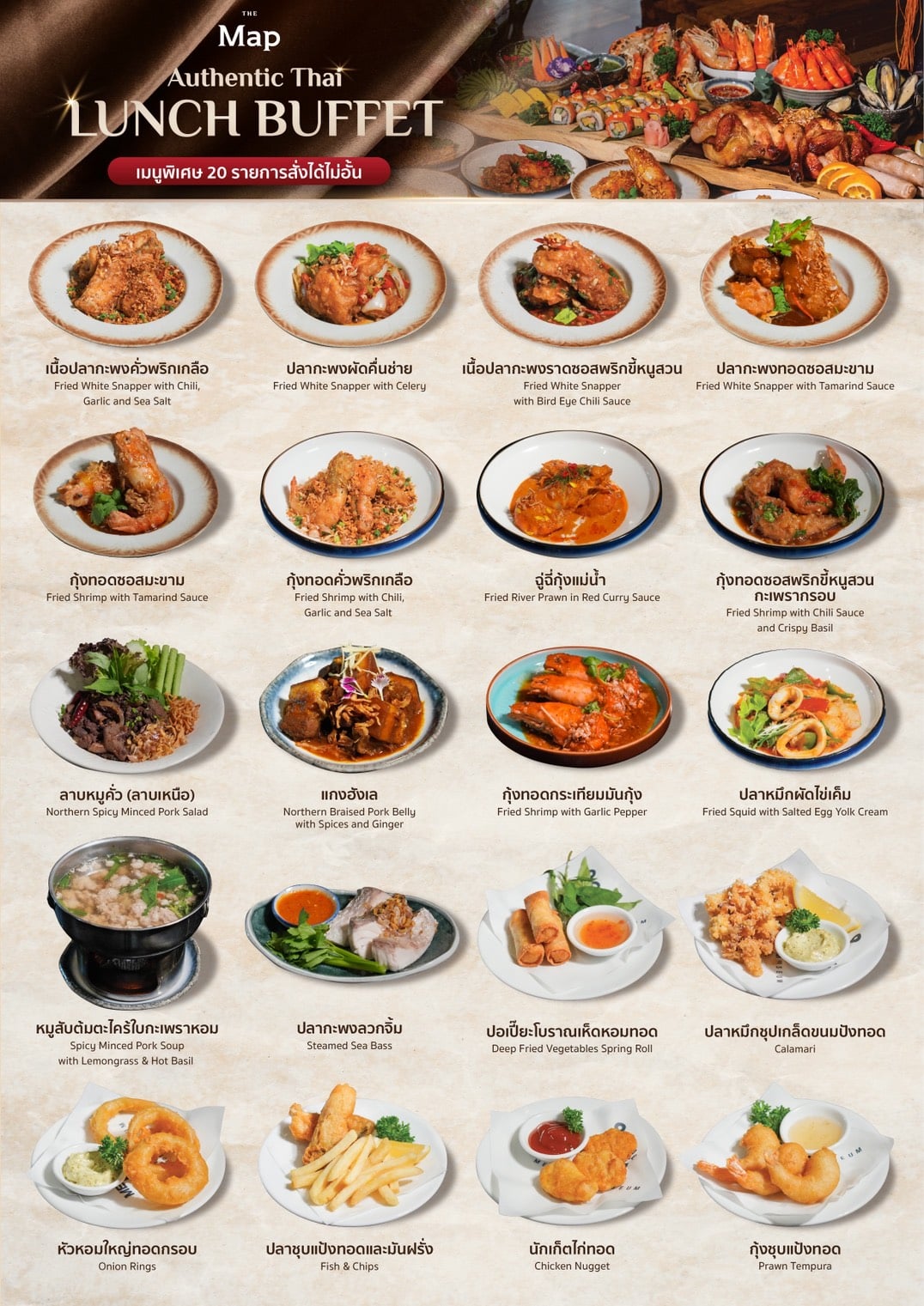 บุฟเฟ่ต์อาหารนานาชาติ มื้อกลางวัน พบกับสเตชั่นอาหารไทยและยุโรป อาทิเช่น สเตชั่นพาสต้า, ซูชิ, สลัดบาร์, สเตชั่นข้าวต่างๆ อาทิเช่น ข้าวผัด, สเตชั่นก๋วยเตี๋ยวต้มยำไข่ออนเซ็น, สเตชั่นของหวาน ไอศครีม, และผลไม้ตามฤดูกาล ในราคาเพียง 759 บาทสุทธิ/ท่าน (จากราคาปกติ 859 บาท) *เมื่อจองผ่านทางออนไลน์เท่านั้น แล้วพบกันทุกวันเสาร์และวันอาทิตย์ เวลา 11.30 – 14.00 น. ไม่จำกัดเวลาทาน…จนกว่าคุณจะอิ่ม ที่ห้องอาหาร THE Map